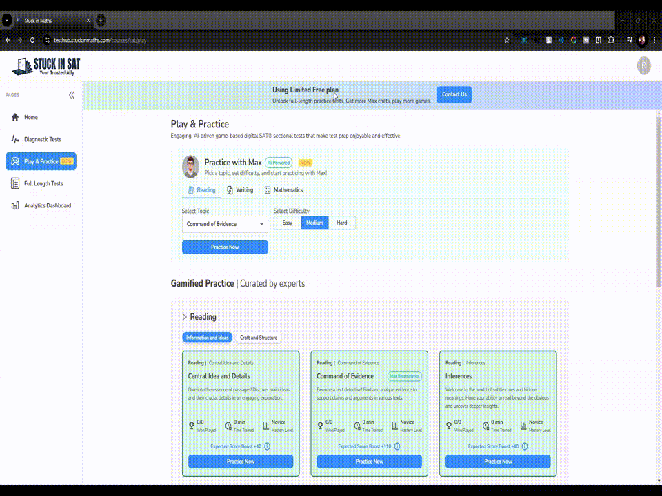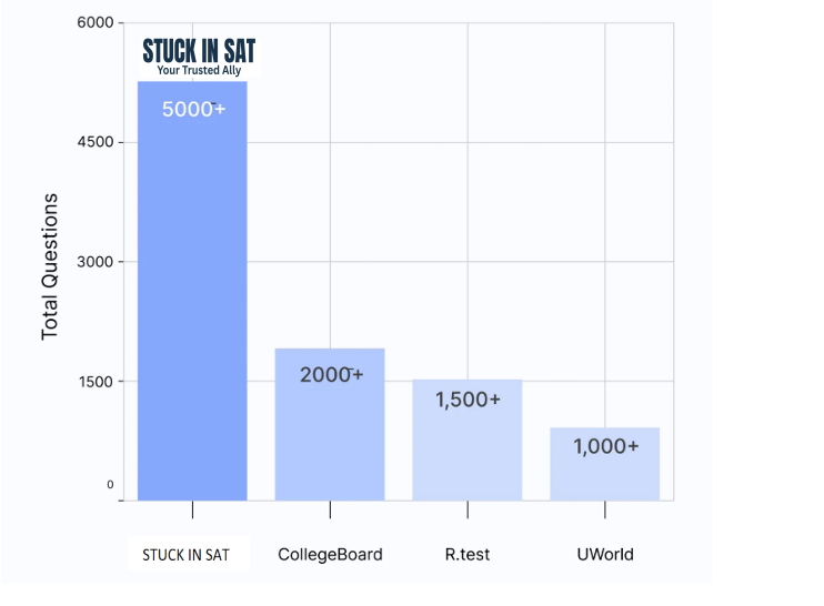 Stuck in SAT delivers over twice as many SAT practice questions as the College Board โ with everything categorized by difficulty and personalized to your performance. The platform adapts as you grow, making sure you're always working on the right thing at the right time.