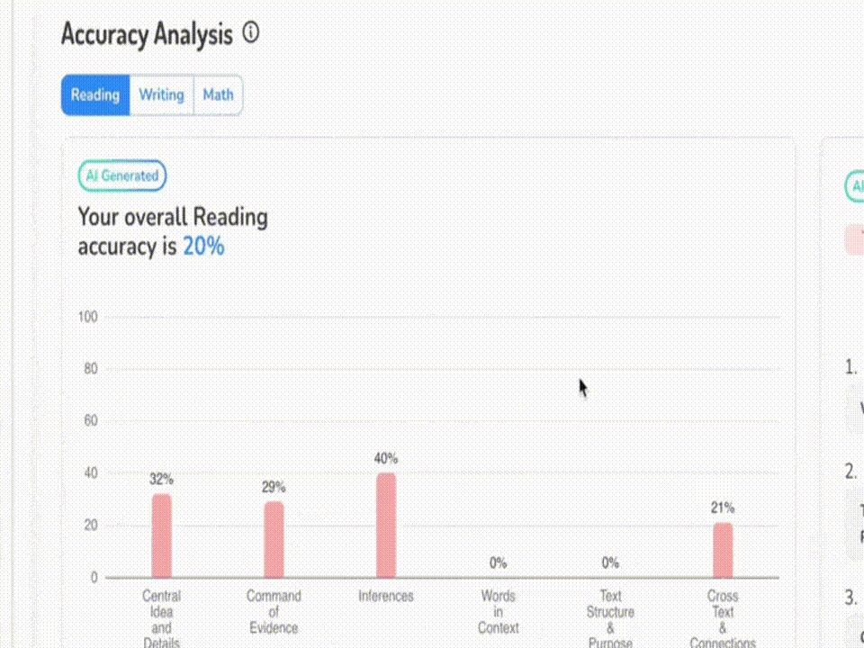 Start with clarity, not guesswork. Our AI-powered diagnostic test quickly identifies a studentโs current SAT level, highlights weak areas, and sets the foundation for smarter preparation, while giving parents a clear first snapshot of where support is needed most.