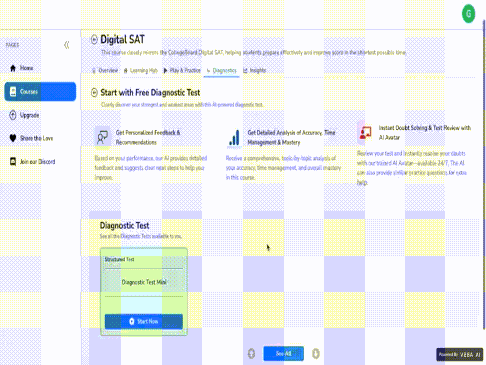 Start with our AI-powered 40-minute diagnostic test to assess your current level and identify areas for improvement.